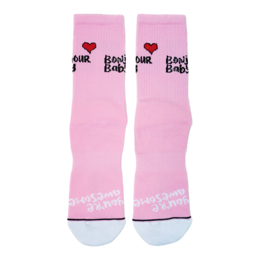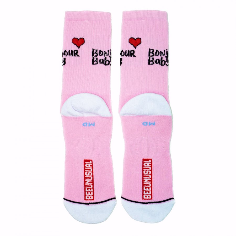 Bee Unusual’s “Bonjour Baby” logo socks are made of soft combed cotton. Featuring 1×1 arch support for snug fit and better stability.